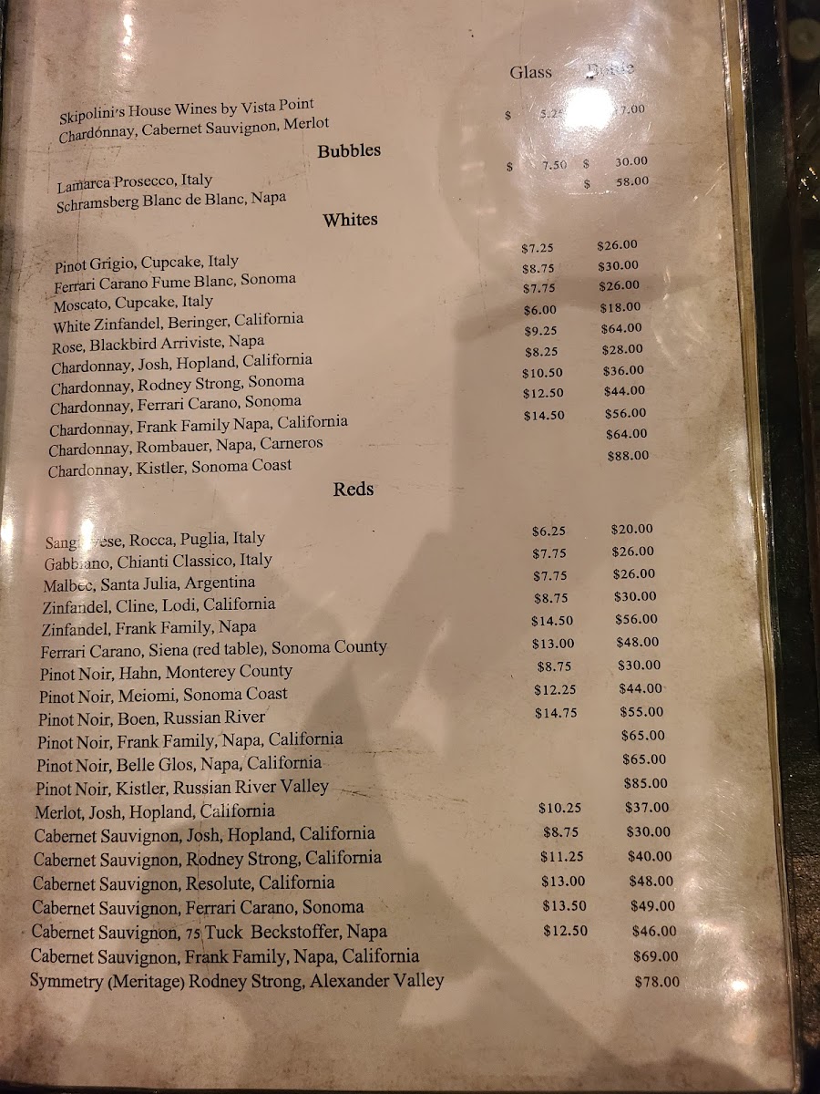 We originally went to Rananza, but when we arrived, the front desk host stuck up guy said they were sold out. I never heard of a sold out restaurant, but it worked out for the best, we end up at Skipolini's and so glad we did. My party of 3 was nicely greeted by the host and was seated immediately, we had a lovely waitress name Karen, she was delightful and attentive. Our entrees was excellent!! And the bottle of red wine was so good and smooth that we killed that bottle in no time. Honestly this Italian restaurant deserves more stars then a 4.2. We started off with an appetizers Buffalo prawns and wow they were so good, the prawns was to tender and succulent. I had the Shrimp scampi, and the shrimp was prawns, not tiny bay shrimp and cooked just right - succulent, the sauce was so flavorful. I highly recommend coming to this restaurant and on the pluse side this place doesn't close till 10:30pm on the weekends. One more thing, the portion are huge